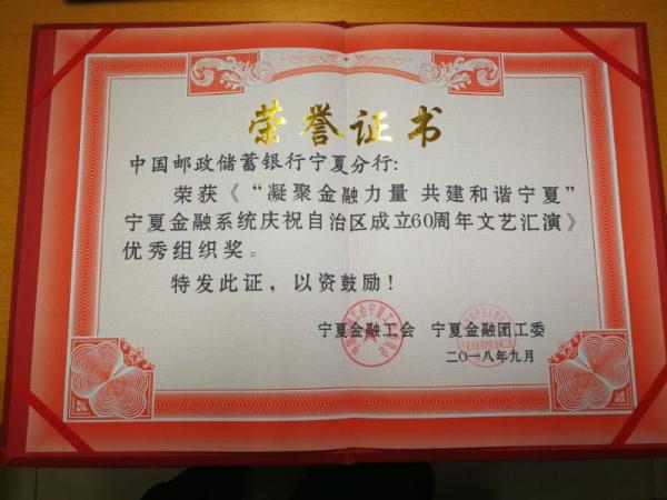 為慶祝自治區(qū)成立60周年暨建國69周年,推動寧夏金融系統(tǒng)職工群眾性文化活動的廣泛開展,豐富廣大職工業(yè)余文化生活,展示新時代寧夏金融職工的精神風貌。9月7日,寧夏金融工會、寧夏金融團工委舉辦了“凝聚金融力量 共建和諧寧夏”—寧夏金融系統(tǒng)慶祝自治區(qū)成立60周年暨迎國慶文藝匯演。此次文藝匯演共有31家單位38個節(jié)目參與,其中由寧夏區(qū)分行主辦,銀川市分行承辦的參演節(jié)目《不忘初心》,因主題突出,藝術感染力強,體現(xiàn)寧夏郵儲銀行員工忠誠擔當、愛崗敬業(yè)、團結奮進、不忘初心的精神風貌。在最終的綜合評審中脫穎而出,獲得三等獎和優(yōu)秀組織獎的好成績。