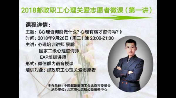 根據(jù)2018年北京郵政職工心理關(guān)愛活動(dòng)安排,北京市郵政分公司建立了一支擁有200余名職工的北京郵政心理關(guān)愛志愿者隊(duì)伍,并專門建立了“北京郵政心理關(guān)愛志愿者(微課群)”。為提高志愿者的心理專業(yè)知識(shí)和解決心理問(wèn)題的能力,北京郵政工會(huì)與心啟航公司合作,將在2018年9月至2019年4月期間為心理關(guān)愛志愿者精心準(zhǔn)備6次微課。9月26日是第一講,北京郵政工會(huì)要求各基層單位的志愿者做好聽課前的準(zhǔn)備工作,力爭(zhēng)帶著問(wèn)題去聆聽、去學(xué)習(xí)、去理解,以達(dá)到良好的實(shí)際效果。(北京郵政工會(huì))