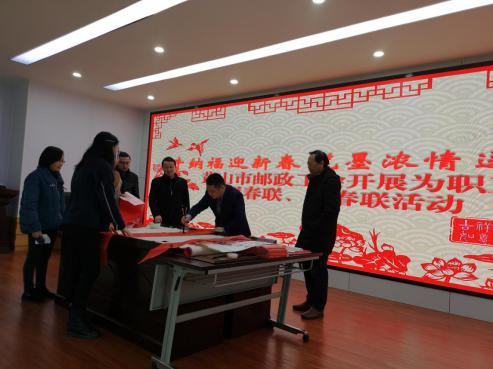 歡歡喜喜送春聯(lián),熱熱鬧鬧過春節(jié)。2月7日下午,黃山市郵政工會在市分公司六樓多功能廳開展“金牛納福迎新春 筆墨濃情送祝福”寫春聯(lián)送春聯(lián)活動,市郵政工會邀請市著名書法家姬臣為廣大員工納“福”字、寫春聯(lián)。