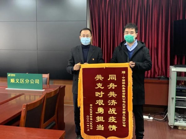2月20日,順義區(qū)高麗營鎮(zhèn)人民政府疫情防控小組工作人員將一面印有“同舟共濟(jì)戰(zhàn)疫情 共克時(shí)艱勇?lián)?dāng)”字樣的錦旗送到了順義區(qū)郵政分公司,并對(duì)順義郵政在疫情防控期間所做出的努力表示衷心感謝。