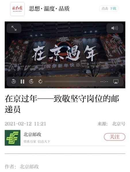 多渠道齊發(fā)力。春節(jié)期間,北京郵政推出特別策劃短片,聚焦“留京過(guò)年” 講述北京郵政投遞員留京過(guò)年,堅(jiān)守崗位的動(dòng)人故事——《每一份快遞年貨的背后都有他們的默默堅(jiān)守》。短片生動(dòng)詮釋了北京郵政人響應(yīng)國(guó)家號(hào)召在京過(guò)年、堅(jiān)守崗位的故事,贏得廣泛關(guān)注,取得了良好的宣傳效果。短片在新華社客戶端、北京日?qǐng)?bào)客戶端、 中國(guó)郵政報(bào)微信平臺(tái)、騰訊網(wǎng)、鳳凰網(wǎng)、 好看視頻、芒果TV、網(wǎng)易視頻、京郵宣傳中心視頻號(hào)等多渠道、多平臺(tái)同步播出。截至22日,據(jù)不完全統(tǒng)計(jì), 合計(jì)瀏覽量超過(guò)80萬(wàn)次。