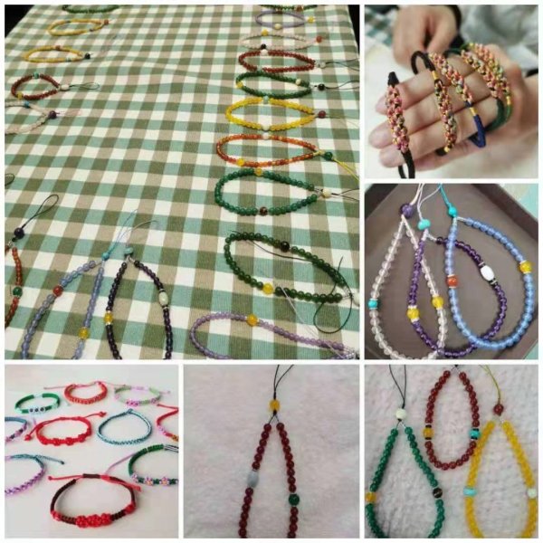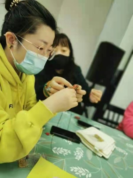結(jié)繩看似簡單,其實(shí)每一個(gè)步驟都很關(guān)鍵,錯(cuò)了一步就會(huì)失敗,幾個(gè)看似簡單的動(dòng)作卻能編織出不同的繩結(jié),在老師不厭其煩的指導(dǎo)下,大家反復(fù)摸索,手法逐漸嫻熟起來!神奇的繩藝加上裝飾品的搭配,顯示出濃濃的中國風(fēng)以它獨(dú)特的魅力征服了大家!難得的手工DIY機(jī)會(huì)讓大家樂在其中。“看我的珠鏈完工啦”“我的七彩手串也好了”聲音此起彼伏,女神們迫不及待迫不及待向在場的人展示自己的手工作品。