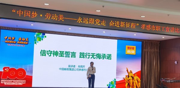 5月8日上午,在孝感市總工會組織舉辦的“中國夢·勞動美--永遠跟黨走 奮進新征程”孝感市職工宣講比賽決賽中,來自孝南區(qū)郵政分公司的職工肖周芹榮獲三等獎。