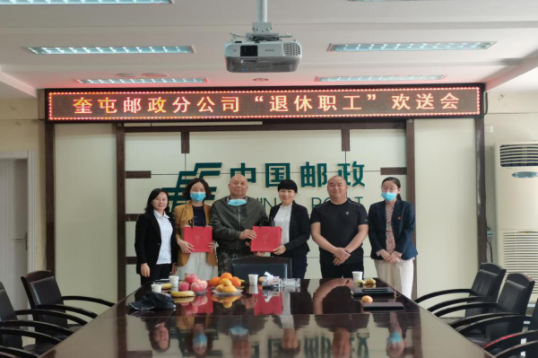 市郵政工會(huì)主席為退體職工頒發(fā)了退休紀(jì)念品。