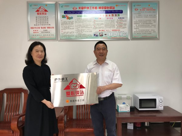5月28日上午,孝感市總工會(huì)副調(diào)研員萬纓來到孝南區(qū)車站郵政支局為新建成的“愛心驛站”授牌。