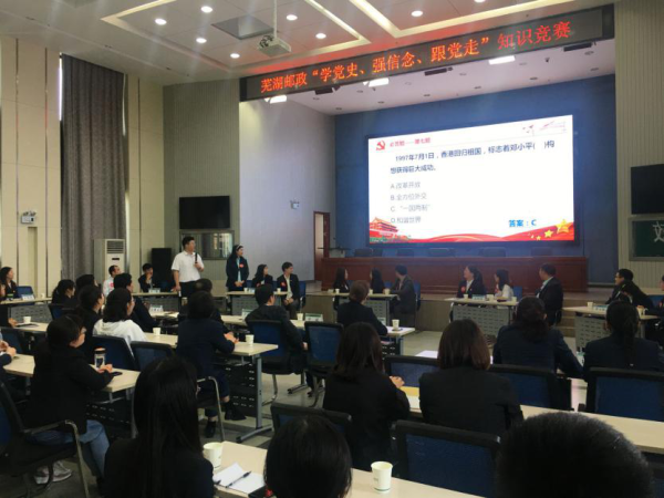 在五四“青年節(jié)”到來前夕,4月30日下午,市分公司、工會在八樓開展青年員工“學(xué)黨史、強信念、跟黨走”讀書活動暨知識競賽活動,旨在通過普及黨史知識,重溫中國共產(chǎn)黨的光輝歷程,進(jìn)一步激發(fā)全市青年員工愛黨愛國的熱情,堅定共產(chǎn)主義信念,共同推動蕪湖郵政在新發(fā)展階段實現(xiàn)更快更好發(fā)展。本次活動還特別邀請了市分公司黨委書記、總經(jīng)理許悅林,黨委委員、副總經(jīng)理湯偉偉出席。 此次活動由全市15個青年理論學(xué)習(xí)小組成員組成,每小組推選1名參賽選手參加比賽,現(xiàn)場通過抽簽的方式,每3名選手組成1支參賽隊伍,共組成5支參賽隊。活動共分為必答題、搶答題、你來比劃我來猜3個環(huán)節(jié)。經(jīng)過激烈的角逐,最終評選出一等獎1名,二等獎2名,三等獎2名。