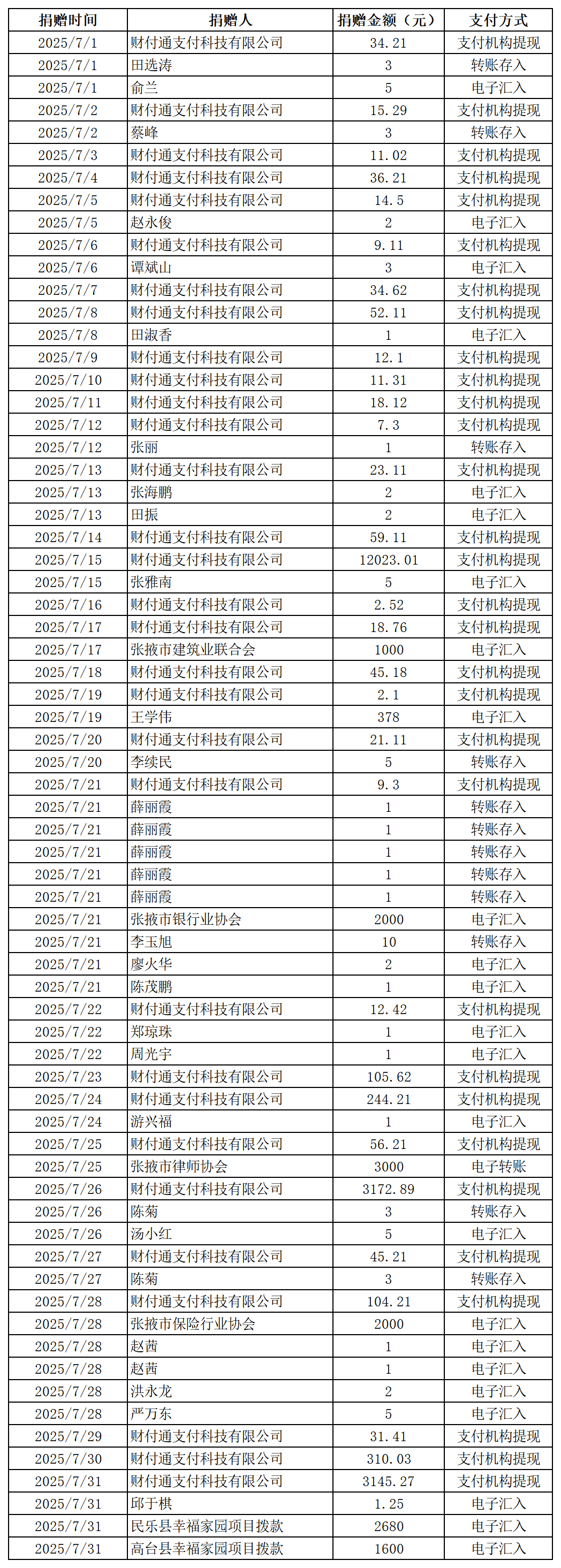 2025年張掖市慈善協(xié)會(huì)積極搭建愛(ài)心平臺(tái),得到廣大愛(ài)心人士和愛(ài)心單位積極響應(yīng),踴躍捐款捐物,現(xiàn)將(2025年7月1日--7月31日)接收到的銀行轉(zhuǎn)賬收入公示如下: